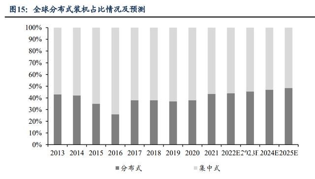 美國:加州強制安裝光伏系統,分布式占比有望提升。2017-2019 年美國分布式光 伏裝機增長有所放緩,但美國加州于 2019 年出臺政策要求從 2020 年起對三層以下新建 建筑強制安裝光伏系統,2021 年美國分布式光伏裝機達 6.6GW,同比增長 18%,我們 預計未來分布式光伏裝機持續快速增長,分布式占比有望提升。 歐洲:分布式占比較為穩定,保持高速增長。歐洲分布式占比較為穩定,2021 年約 為 59%,2021 年歐洲分布式裝機量約 15.2GW,俄烏沖突下居民電價高漲,歐洲分布式 需求旺盛,我們預計 2022 年歐洲分布式光伏將持續增長,占比或提升至 70-80%,對應 2022 年裝機達到 35GW 以上,實現翻倍多增長。