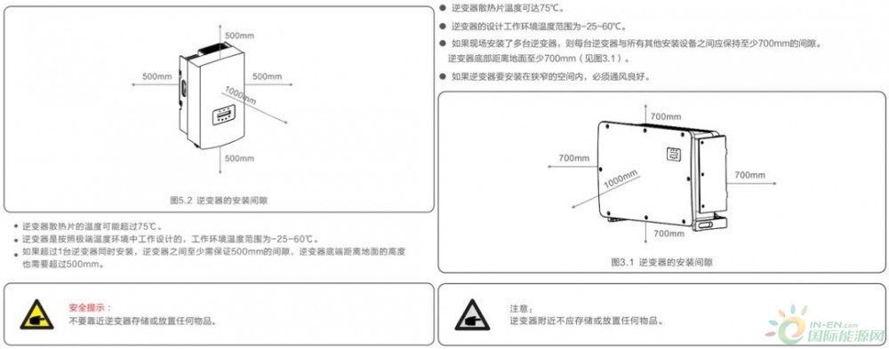 多臺逆變器安裝時,安裝距離也非常重要,這決定了逆變器散熱性能和風扇工作效率。若距離較小,風扇工作頻率增加,且散熱也不理想,則會導致系統發電量受影響。不同逆變器安裝距離不同,建議參考錦浪科技相應產品說明書: