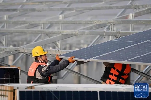 1月5日,建設者在華電海晶光伏項目B標段施工。
