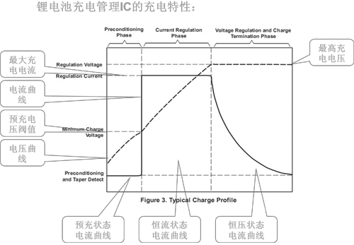 有上圖可以看出,鋰電池充電電流和電壓是動態變化的,這是由鋰電池本身的化學物質決定的。所以需要根據鋰電池本身的充電特性來配置充電IC的性能,以達到正確,安全,高效的使用鋰電池。日常表述中的“鋰電池充電電流”是針對鋰電池在充電過程中所處快速充電階段的充電電流而言的,作為一個動態的過程,鋰電池最理想充電電流實際上是分為三個階段的。常用鋰電池充電IC如TP4012A、TP8052、TP8056,本文最后處有部分介紹。