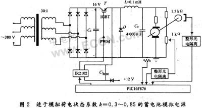 需要模擬電源進行模擬的蓄電池參數是蓄電池電勢E和蓄電池內阻Ri,它們都是荷電狀態系數k的非線性函數。這些非線性函數難于用解析式準確表達,宜用實驗方法事先予以確定,然后存于電腦中,用查表方法調用。注意到荷電狀態系數k的最佳范圍是0.3~0.85,可在這個范圍內進行幾十次采樣試驗,記錄下蓄電池空載電壓E(k)和某一啟動電流下的蓄電池端電壓U(k),△U=E(k)-U(k)就反映蓄電池內阻Ri(k)造成的電壓降。因為蓄電池電勢E與k一一對應,給定一個E值就等于確定了荷電狀態。用模擬電源代替蓄電池時,可先給定一個某一荷電狀態下與蓄電池電勢E等效的電壓值以及某一負載下的電流值,可測出一個與蓄電池對應的△U?!鱑與電流I之比△U/I即為模擬電源的等效內阻Ri。適當選擇電路的漏阻抗參數,就能在k=0.3~0.85范圍內較好地用模擬電源來模擬某一具體容量下的蓄電池內阻Ri。