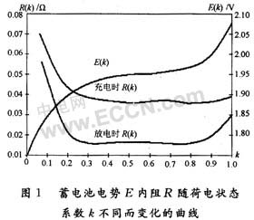 蓄電池的電勢E、內阻Ri與電池的荷電狀態有關。荷電以系數k表示,其值在0~1之間,0代表未荷電,1代表滿荷電。隨荷電系數k由0上升,蓄電池電勢非線性地增大,內阻Ri則呈現先下降最后又略有升高的形狀,如圖1所示。由圖1可見,蓄電池內阻Ri的充、放電曲線亦有差別。起動機每起動一次,荷電狀態系數k均會下降百分之幾,變化量很小;而蓄電池電勢E(k)的變化則視k之值而異。當k在0.3~0.85范圍內時,起動機每起動一次E(k) 變化很小,接近恒值,但當k>0.85和k<0.3時,隨k值的小變化,E(k)變化較為明顯。在設計蓄電池模擬電源控制軟件時應予以考慮。