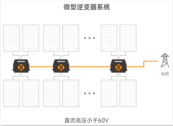 微型逆變器系統為全并聯電路設計,組件之間不再有電壓疊加,直流電壓小于60V,從根本上解決了由于高壓直流拉弧引起火災的風險,消除了“直流拉弧風險”與“電擊風險”。