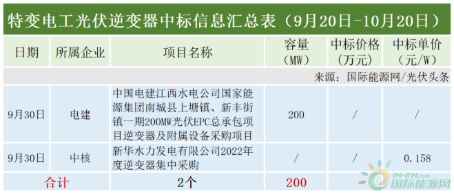 本統(tǒng)計(jì)周期,特變電工中標(biāo)2個(gè)項(xiàng)目(標(biāo)段),確定中標(biāo)容量200MW。這個(gè)2個(gè)項(xiàng)目(標(biāo)段)招標(biāo)人為中國(guó)電建以及中核集團(tuán)。