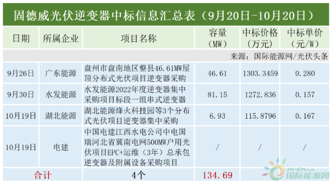 固德威本統(tǒng)計(jì)周期中標(biāo)廣東能源、水發(fā)能源、湖北能源以及中國(guó)電建等企業(yè)4個(gè)項(xiàng)目,合計(jì)容量134.69 MW。