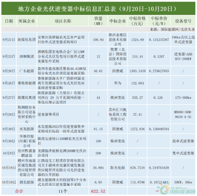 地方企業(yè)方面,據(jù)國(guó)際能源網(wǎng)/光伏頭條(PV-2005)統(tǒng)計(jì),有11個(gè)項(xiàng)目定標(biāo),確定定標(biāo)容量622.52MW。固德威、華為、陽光電源、株洲變流等企業(yè)成為最終贏家。