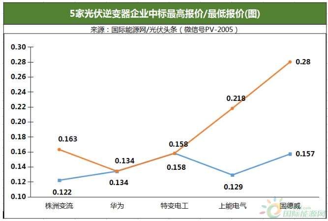 最高中標(biāo)價(jià)出自廣東能源的盤州市盤南地區(qū)整縣46.61MW屋頂分布式光伏項(xiàng)目逆變器采購(gòu)。固德威中標(biāo)價(jià)為1303.3459萬元,折合單價(jià)0.28元/W。