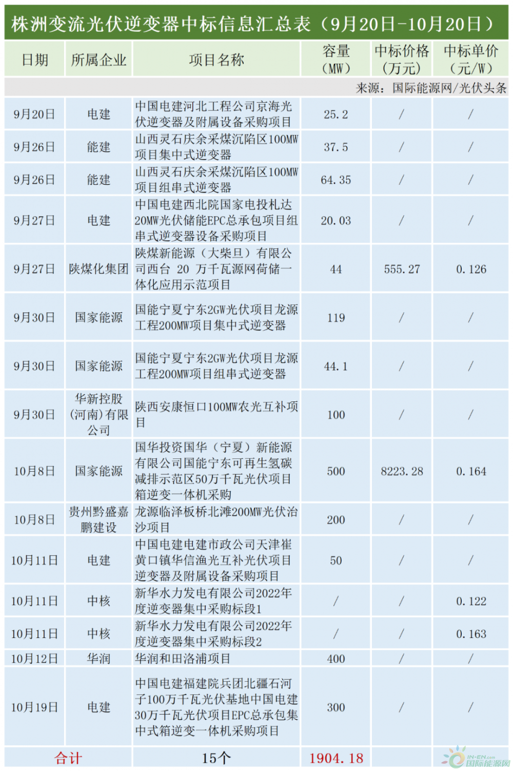 株洲變流9月下旬以來,表現(xiàn)強(qiáng)勢(shì)。據(jù)國(guó)際能源網(wǎng)/光伏頭條(PV-2005)統(tǒng)計(jì),株洲變流本統(tǒng)計(jì)周期中標(biāo)中國(guó)電建、中核集團(tuán)、陜煤化集團(tuán)、國(guó)家能源集團(tuán)等企業(yè)15個(gè)項(xiàng)目(標(biāo)段),確定中標(biāo)容量1904.18MW。