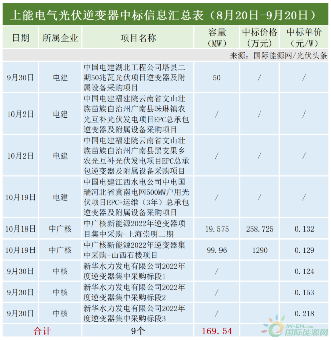 據(jù)國(guó)際能源網(wǎng)/光伏頭條(PV-2005)觀察,本統(tǒng)計(jì)周期,上能電氣表現(xiàn)非常出色,中標(biāo)9個(gè)項(xiàng)目(標(biāo)段)是所有企業(yè)之中中標(biāo)項(xiàng)目數(shù)最多的企業(yè),但是多數(shù)項(xiàng)目沒有披露采購(gòu)容量。上能電氣中標(biāo)項(xiàng)目所屬企業(yè)包括中國(guó)電建、中廣核、中核集團(tuán)等,確定中標(biāo)容量169.54 MW。