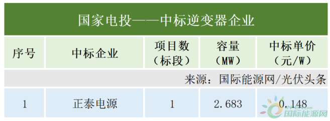 國(guó)家電投在本統(tǒng)計(jì)周期有1個(gè)項(xiàng)目定標(biāo),容量2.683MW,正泰電源作為中標(biāo)人,中標(biāo)價(jià)為0.148元/W。