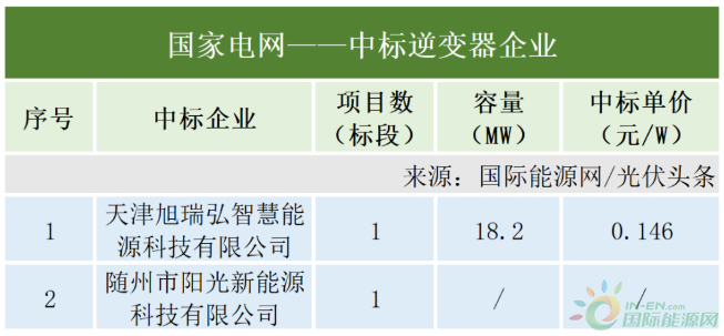 國(guó)家電網(wǎng)有2個(gè)項(xiàng)目定標(biāo),確定定標(biāo)容量18.2MW。天津旭瑞弘智慧能源科技有限公司、隨州市陽光新能源科技有限公司為兩個(gè)項(xiàng)目的中標(biāo)人。