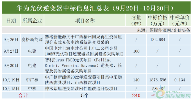 本統(tǒng)計(jì)周期,國(guó)際能源網(wǎng)/光伏頭條(PV-2005)統(tǒng)計(jì),華為中標(biāo)項(xiàng)目所屬企業(yè)包括中國(guó)電建、中核、中廣核等央國(guó)企,合計(jì)中標(biāo)容量240MW。