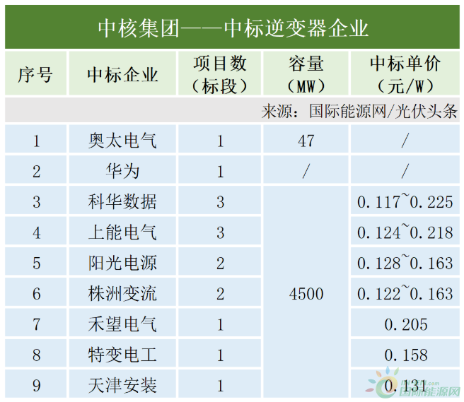 此外,華為與山東奧太電氣也中標(biāo)了中核集團(tuán)的逆變器采購(gòu)項(xiàng)目。具體中標(biāo)情況如下: