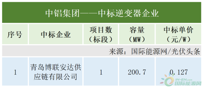 中鋁集團(tuán)有1個(gè)逆變器采購(gòu)項(xiàng)目定標(biāo),容量為200.7MW。青島博聯(lián)安達(dá)供應(yīng)鏈有限公司作為中標(biāo)人,中標(biāo)價(jià)格為0.127元/W。