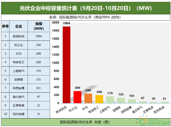 國(guó)際能源網(wǎng)/光伏頭條(PV-2005)統(tǒng)計(jì),9月20日-10月20日國(guó)內(nèi)逆變器招投標(biāo)市場(chǎng),株洲變流、華為、陽光電源、特變電工、上能電氣、科華數(shù)據(jù)、固德威、特變電工、正泰電源等25家企業(yè),共同贏得了8.71GW的逆變器招標(biāo)采購(gòu)訂單。