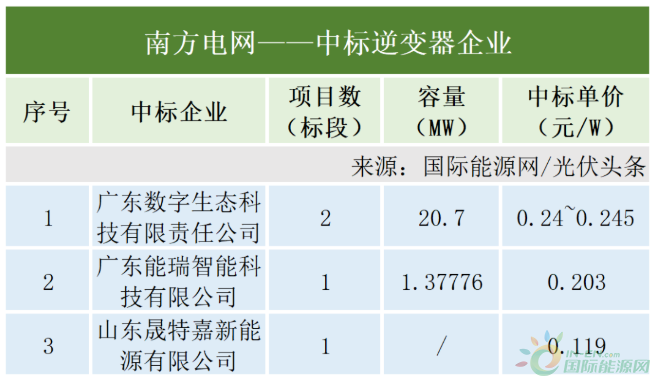 南方電網(wǎng)有4個(gè)項(xiàng)目定標(biāo),合計(jì)容量22.08MW。其中廣東數(shù)字生態(tài)科技有限責(zé)任公司中標(biāo)2個(gè)項(xiàng)目,容量20.7MW,另外兩個(gè)項(xiàng)目的中標(biāo)人為廣東能瑞智能科技有限公司以及山東晟特嘉新能源有限公司。