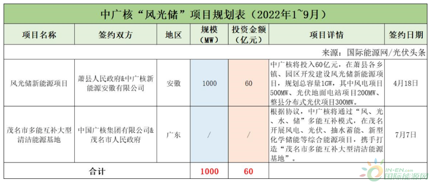 截至2022年9月30日,中廣核共簽約(規劃)2個風光儲項目,其中已明確項目規模為1GW,有1個項目明確投資金額60億元。