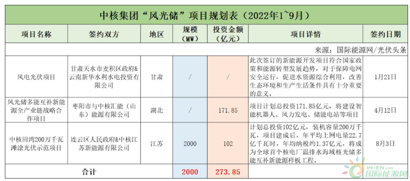 截至2022年9月30日,中核集團共簽約(規劃)3個風光儲項目,明確規模共計2GW。其中有2個項目明確投資金額273.85億元。