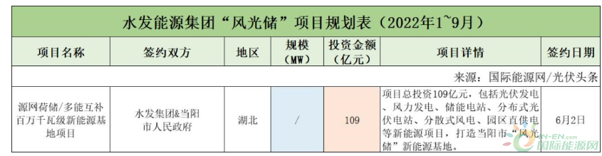 截至2022年9月30日,水發能源集團共簽約(規劃)1個風光儲項目,明確投資金額109億元。
