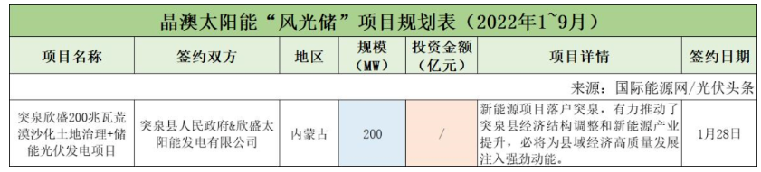 截至2022年9月30日,晶澳太陽能共簽約(規劃)1個風光儲項目,項目規模為200MW。