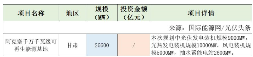 值得注意的是,甘肅酒泉市阿克塞哈薩克族自治縣人民政府發布文件顯示,阿克塞千萬千瓦級可再生能源基地規劃中光伏發電裝機規模9000MW,光熱發電裝機規模10000MW,風電裝機規模5000MW,抽水蓄能電站2600MW,規模合計26.6GW。