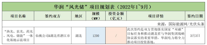 截至2022年9月30日,華潤共簽約(規劃)1個風光儲項目,項目規模1.2GW。