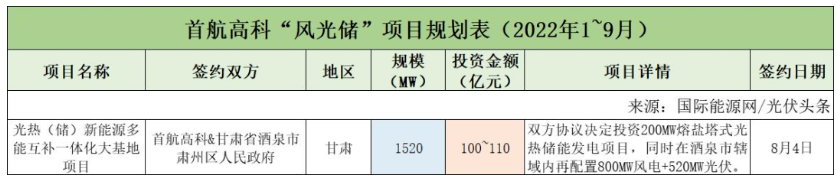 截至2022年9月30日,首航高科共簽約(規劃)1個風光儲項目,項目規模為1.52GW,投資金額為100~110億元(注:統計時取值110億元)。