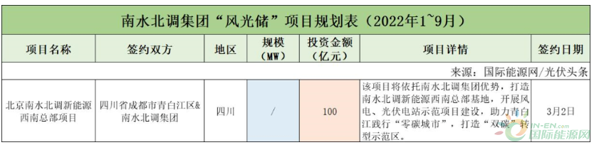 截至2022年9月30日,南水北調集團共簽約(規劃)1個風光儲項目,投資金額為100億元。