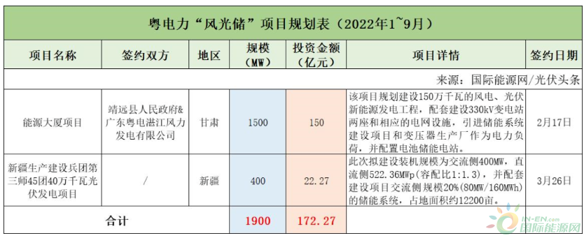 截至2022年9月30日,粵電力共簽約(規劃)2個風光儲項目,明確規模共計1.9GW,明確投資金額共計172.27億元。